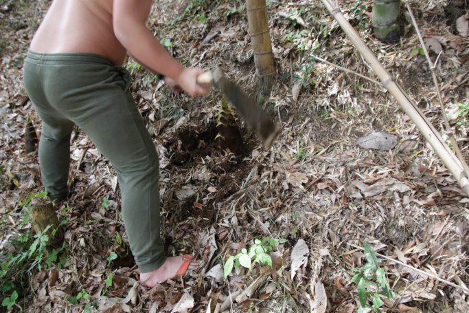 - タケノコの周りを掘って、タケノコの根の所まで掘っていく