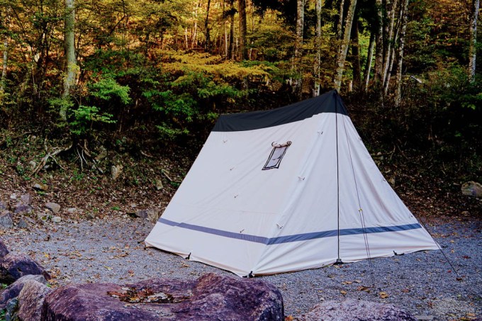 前面を跳ね上げれば『ベイカーテント』みたいな雰囲気で、フルクローズすればレトロなAフレームテントみたいな独特な形状をしたテント。